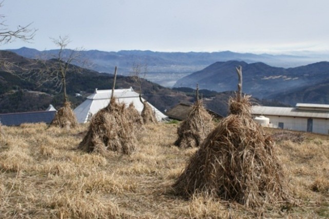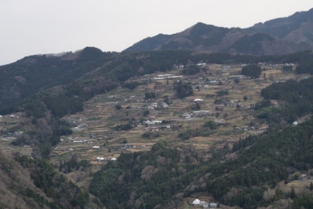 ・さらに、傾斜地集落の機能を概観すれば、約100~700m内に形成された集落は、森林に周囲を囲まれ、そのことが風害、水害、霜害、傾斜地集落の崩壊を防いでいる。民家は農業に不適な場所に建て、適所にカヤ場(採草地)を配置し、地勢に合わせ結晶片岩の石垣を効果的に積み、適所で農地の有効的配置を行い、要所に巨樹・巨木・社叢林・森を残し、自然への畏敬、感謝などの宗教的心情をもちつつ傾斜地農業を営んでいる。共同体意識を醸成する存在として要所に「御堂」が置かれている。剣山系では、民家、採草地、畑地、棚田、果樹地、社叢、お堂、神社などが一体感をなし、独特な豊かさを感じる農村景観がパノラマ的に構成されているのである。